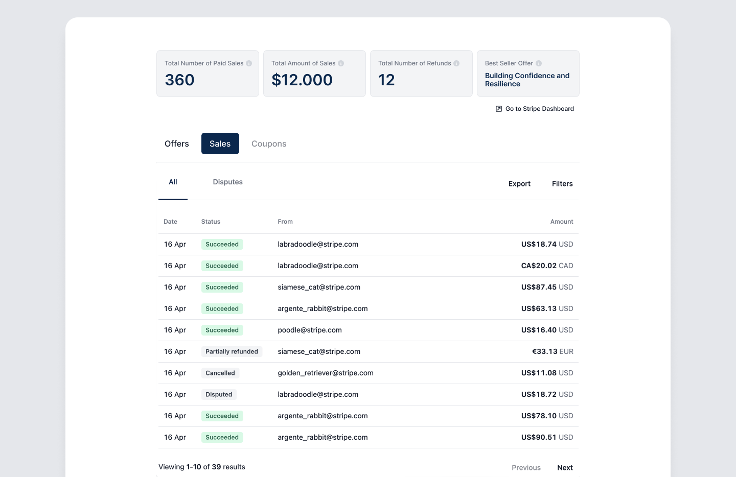 Create your offer, share the link, and let clients purchase 24/7. No sales calls or